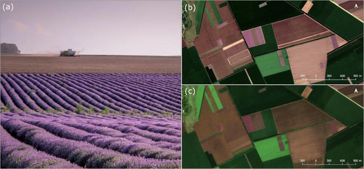 Figure 1. (a) Lavender field, Provence, France. Photo: Anton Gvozdikov, Google Earth, (b) lavender fields (dark-gray colour), Provence, France. Google Earth. 03.05.2016, (c) lavender fields (purple colour), Provence, France. Sentinel-2 image, true colours. 03.07.2020.